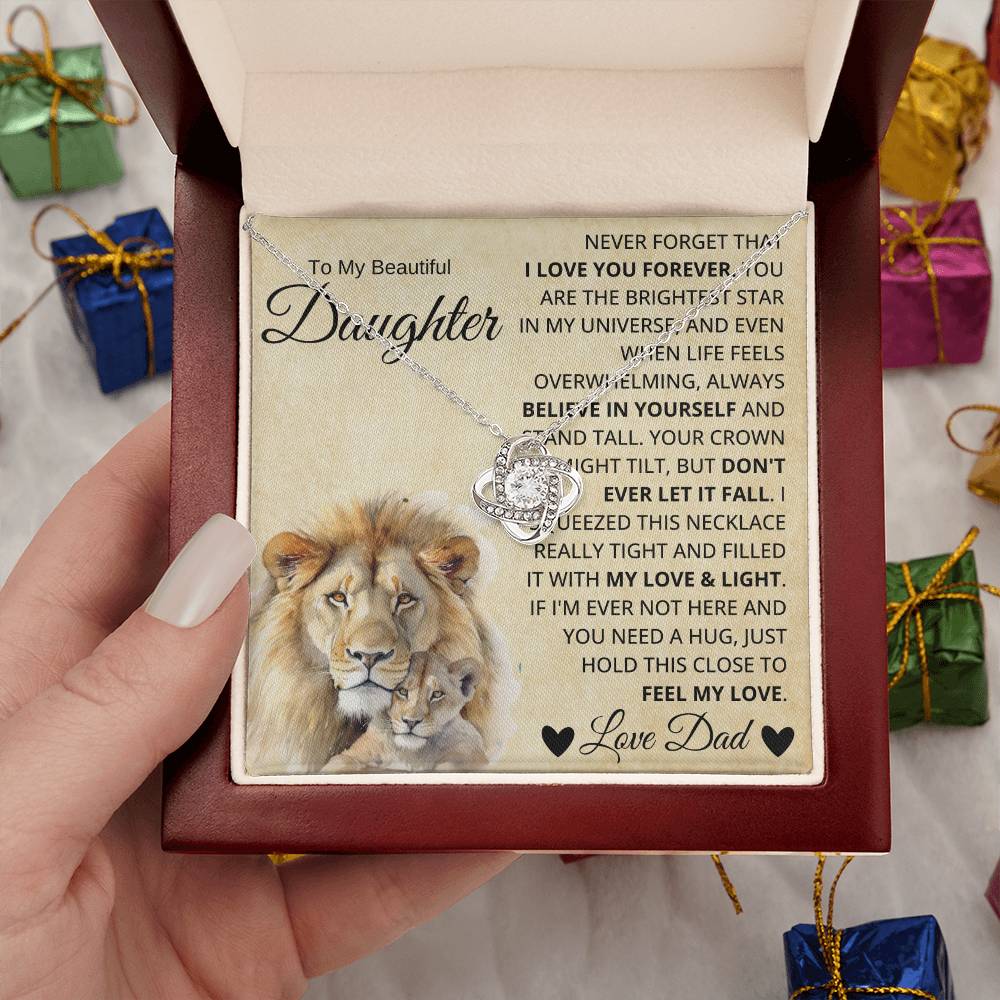 Never forget that I love you forever. You are the brightest star in my universe, and even when life feels overwhelming, always believe in yourself and stand tall. Your crown might tilt, but don't ever let it fall. I squeezed this necklace really tight and filled it with my love and light. If I'm ever not here and you need a hug, just hold this close to feel my love. Love, Dad."