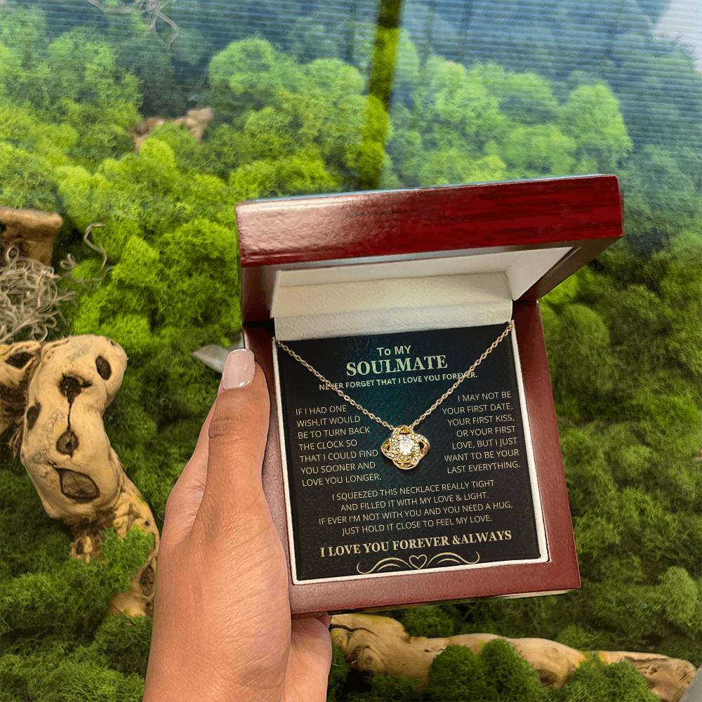 The Message Says: "To My Soulmate - Never forget that I love you forever. If I had one wish, it would be to turn back the clock so that I could find you sooner and love you longer. I may not be your first date, your first kiss, or your first love, but I just want to be your last everything. I squeezed this necklace really tight and filled it with my love and light. If I’m ever not here and you need a hug, just hold this close and feel my love. I Love You Forever and Always."