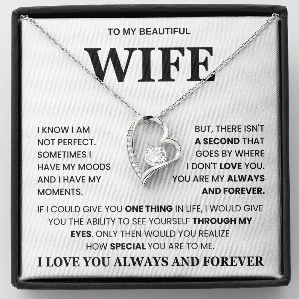 I know I am not perfect. Sometimes I have my moods, and I have my moments. But, there isn't a second that goes by where I don't love you. You are my always and forever.  IF I COULD GIVE YOU ONE THING IN LIFE, I WOULD GIVE YOU THE ABILITY TO SEE YOURSELF THROUGH MY EYES. ONLY THEN WOULD YOU REALIZE HOW SPECIAL YOU ARE TO ME. I LOVE YOU ALWAYS AND FOREVER"