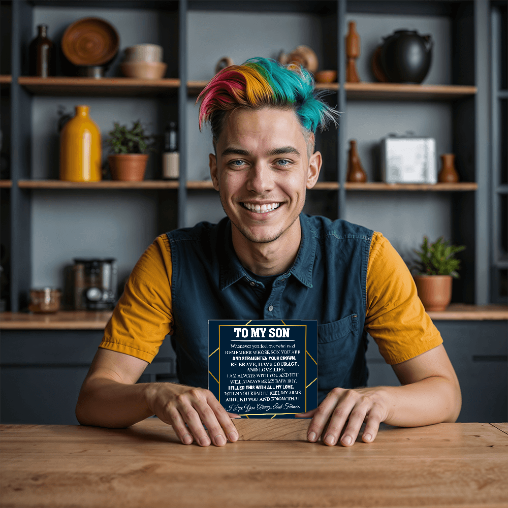 "TO MY SON, Whenever you feel overwhelmed, remember whose son you are.Β and straighten your crown.Β BE BRAVE, HAVE COURAGE, AND LOVE LIFE. I am always with you, and you will always be my baby boy. I FILLED THIS WITH ALL MY LOVE. When you read it, feel my arms around you and know that I Love You, Always And Forever."